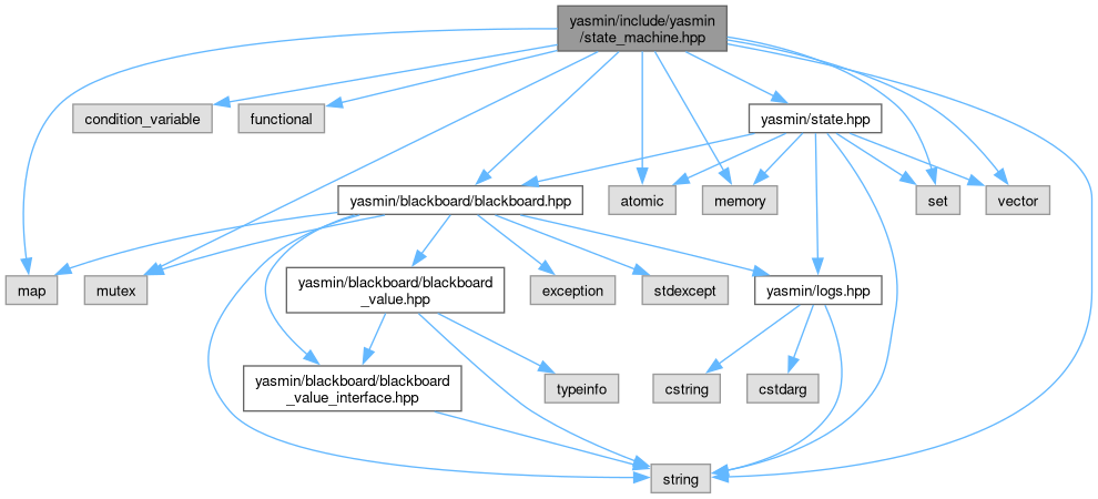 #include <atomic>#include <condition_variable>#include <functional>#include <map>#include <memory>#include <mutex>#include <set>#include <string>#include <vector>#include "yasmin/blackboard/blackboard.hpp"#include "yasmin/state.hpp"