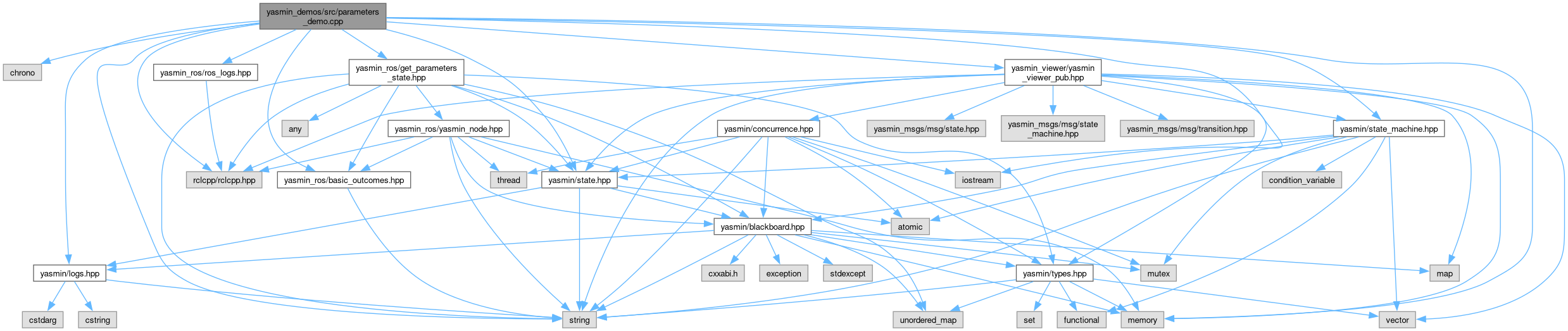 #include <chrono>#include <iostream>#include <memory>#include <string>#include "rclcpp/rclcpp.hpp"#include "yasmin/logs.hpp"#include "yasmin/state.hpp"#include "yasmin/state_machine.hpp"#include "yasmin_ros/basic_outcomes.hpp"#include "yasmin_ros/get_parameters_state.hpp"#include "yasmin_ros/ros_logs.hpp"#include "yasmin_viewer/yasmin_viewer_pub.hpp"